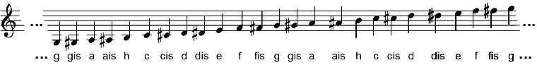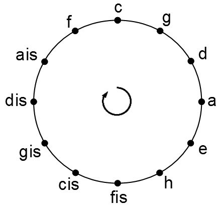 Die Quinte von c ist g, und c selbst ist die Quinte des nächst niedrigeren f: f→c→g. Wir sehen also: Zwei Quintenschritte führen zum gleichen Ergebnis wie ein Ganztonschritt und eine Oktave. (Zwei Halbtonschritte sind ein Ganztonschritt.) Deshalb lässt sich die eben begonnene Quintenfolge einfach weiterführen: f→c→g→d→a→e→h. Von e nach f sowie von h nach c haben wir keine Ganzton- sondern Halbtonschritte, so dass nach e und h in der Quintenfolge fis und cis kommen: f→c→g→d→a→e→h→fis→cis→gis→dis→ais. Somit können wir alle 12 Tonhöhen der Tonleiter durch fortgesetzte Quintenbildung erzeugen, auch wenn sich die einzelnen Töne bei Verwendung des reinen Quintenverhältnisses 2:3 ein wenig von denen der gleichstufigen Tonleiter unterscheiden. Diese Art der Stimmung nur nach reinen Quinten heißt pythagoräische Stimmmung.