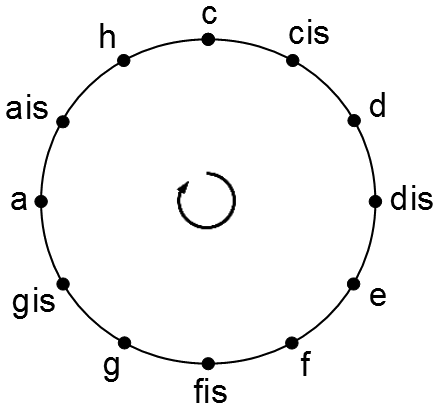 Wenn wir nur solche Tonhöhen voneinander unterscheiden, die nicht durch eine oder mehrere Oktaven getrennt sind, dann bekommt unser Tonsystem eine zyklische Struktur. Ausgehend z.B. von c gelangen wir nach 12 Halbtonschritten (I1) wieder zu einem c, das wir jedoch zum vorhergehenden wegen des Oktavabstands (I12) als äquivalent ansehen wollen. Salopp gesagt fassen wir also alle c's (alle c genannten Tonhöhen) zu einer Tonhöhenklasse zusammen; ebenso alle cis genannten Tonhöhen zu einer weiteren Klasse etc.