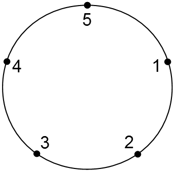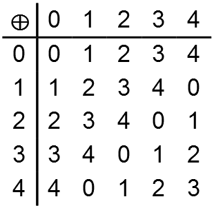 Die Menge {0, 1, 2, 3, 4}, wir nennen sie C5, mit der Addition ⊕ am Zifferblatt der Uhr als Verknüpfung hat folgende Eigenschaften: