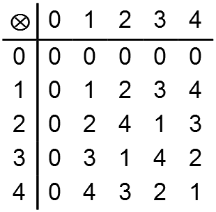 Weiterhin lässt sich auf jeder Gruppe (Cn,⊕) auch die Multiplikation einführen. Wir machen das ebenso wie bei den natürlichen Zahlen als wiederholte Addition und sagen n⊗m = m⊕m⊕…⊕m (d.h. n-mal m). Damit erhalten wir für C5 die folgende 1⊗1-Tafel: