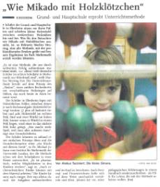 Schüler der Grund- und Hauptschule in Ilbesheim sitzen vor ihren Pulten und schieben kleine Holzwürfel zwischen senkrechten Holzstäben hin und her. Was für den Betrachter wie Mikado mit Holzklötzchen aussieht, ist, so Rektorin Marlies Meyring, eine alte Methode, mit der problemlösendes Denken geübt und bessere Ergebnisse im Fach Mathematik erzielt werden könnten. „Es ist eine Methode, die uns durch weltweiten Erfolg aufmerksam machen muß, vor allem, weil deutsche Schüler im achten Schuljahr in Mathematik nur Mittelmaß sind“, stellt Marlies Meyring fest. Die Unterrichtsmethode beruht auf dem Prinzip des „Abakus“, eines antiken Rechenbretts mit verschiebbaren Holzringen auf Stäben, das noch heute in Asien benutzt wird. Die Schüler in Ilbesheim legen mit Holzstäben Felder, zwischen denen je nach Rechenaufgabe Holzwürfel bewegt werden: 57 plus 28 bedeutet sieben und acht Holzwürfel im rechten Feld, fünf und zwei Holzwürfel im linken Feld. Immer wenn 10 Würfel in einem Feld liegen, wird einer in das nächste Feld gelegt. „Das macht mehr Spaß, weil man alles anfassen kann“, sagt eine Grundschülerin. |